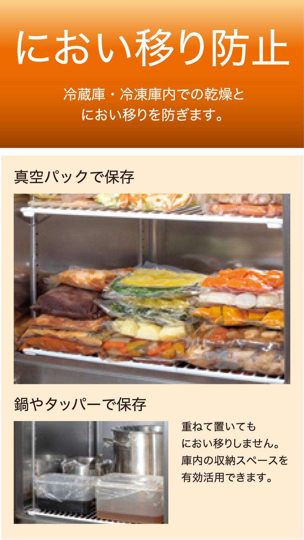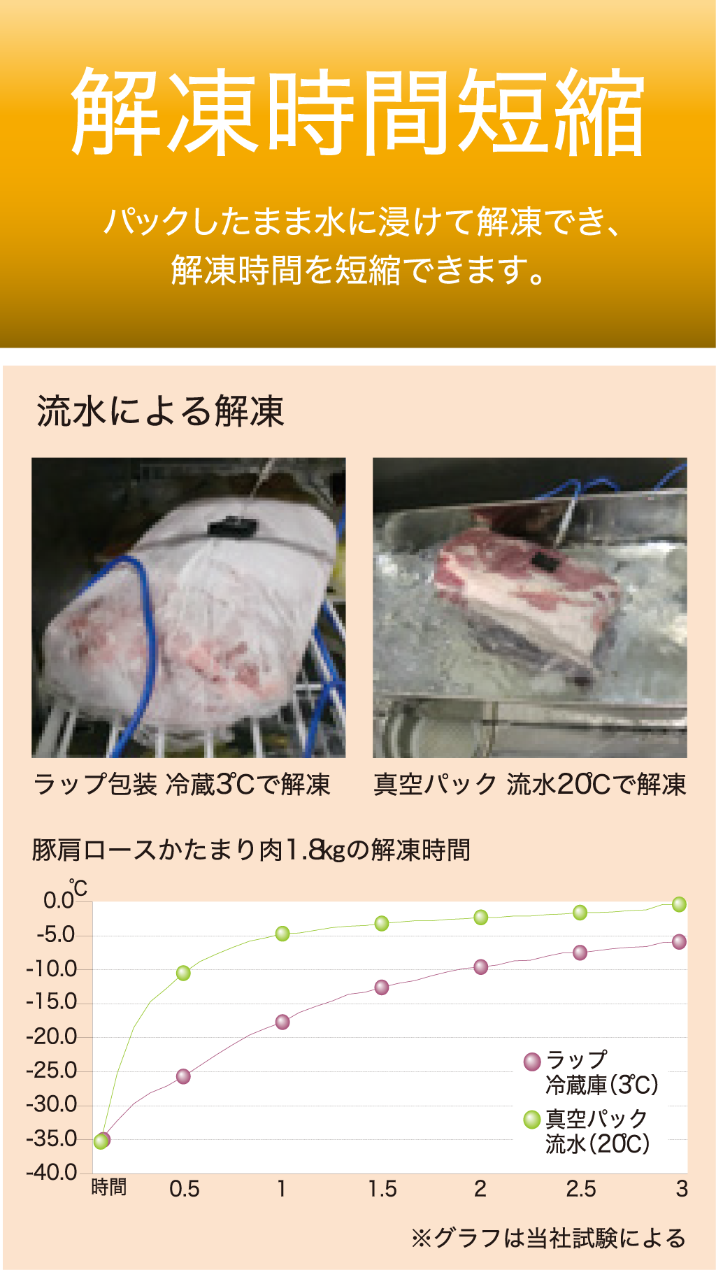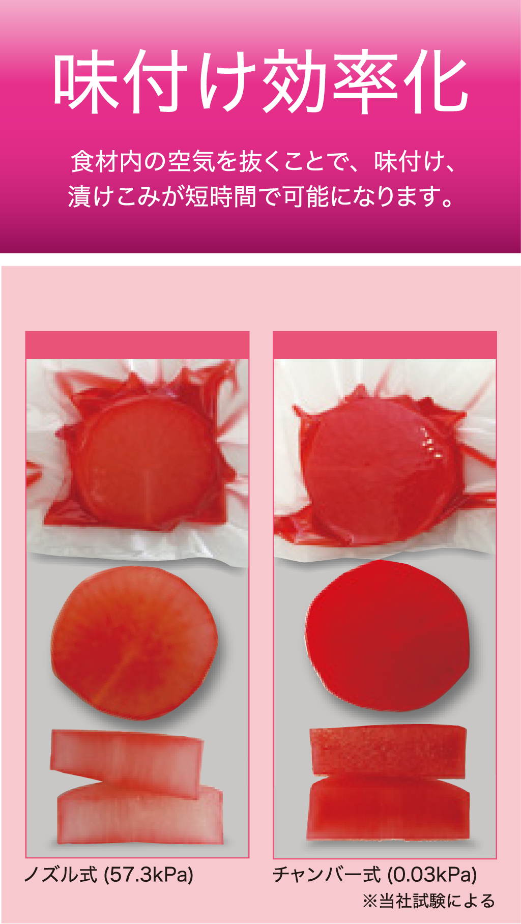 食材の温度に合わせて使い分けて、アツアツの食材は、温度を測っておまかせ自動設定!食材の温度を測ることで、菌の繁殖温度帯を避けてパック。ドロドロ、サラサラ、冷たいもの、温かいもの、様々な食材のパックが可能です。